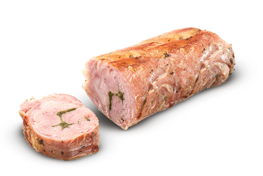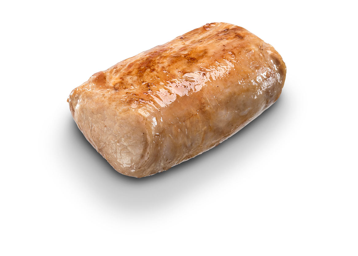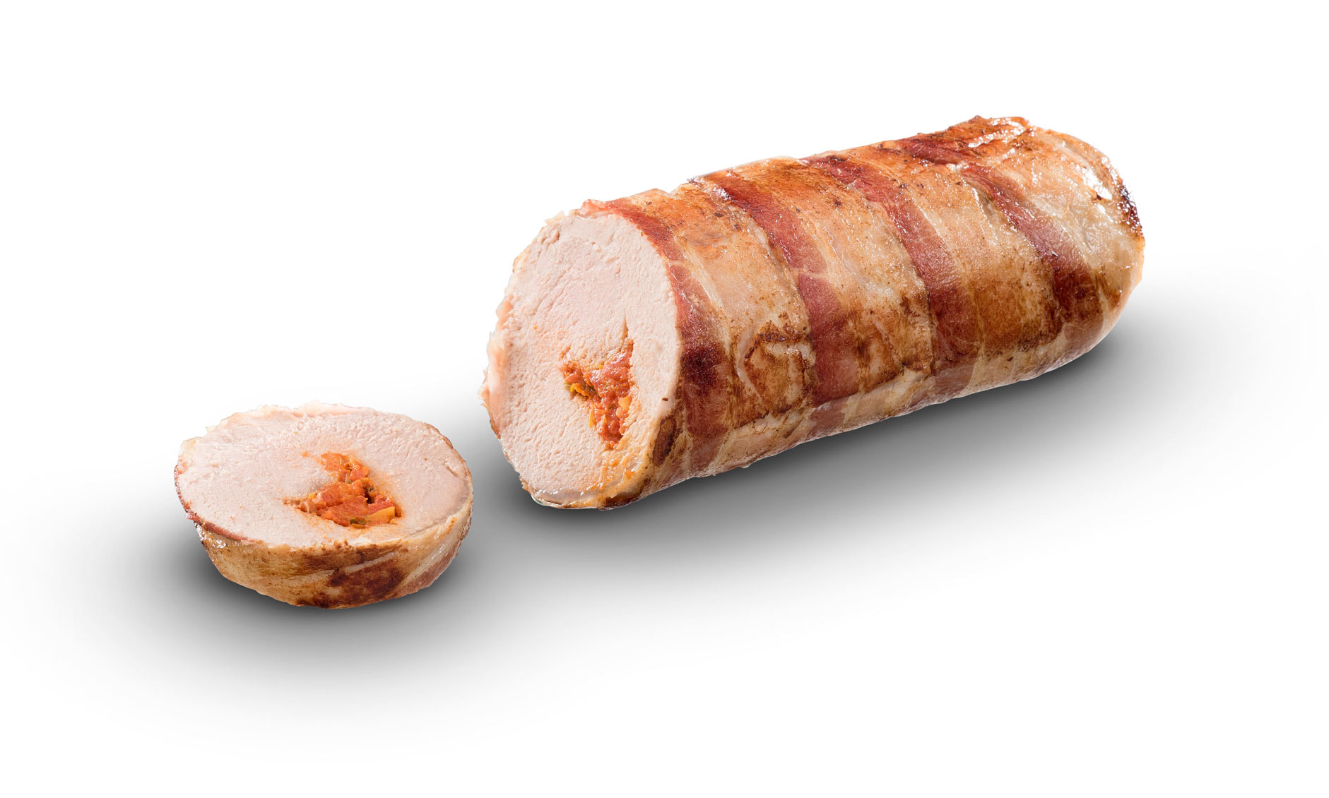 Varkenshaas rol, gevuld met zontomaat, in pancetta. Vacuüm, ca. 400 gram.