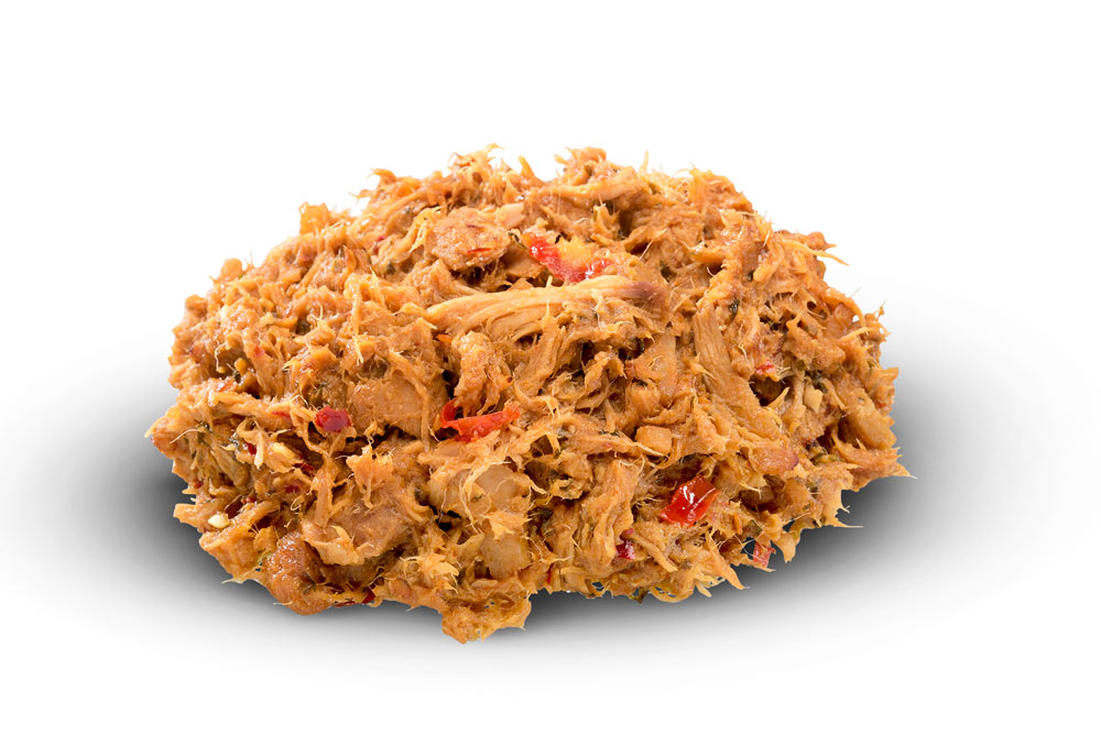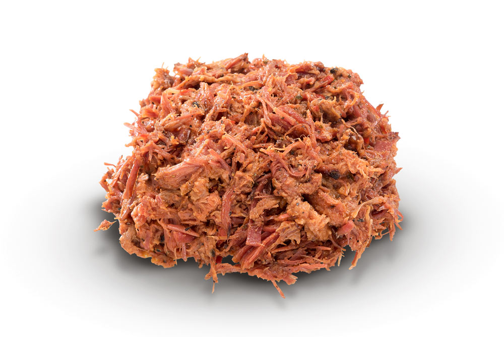 Gemarineerd en langzaam gegaard runderborst, in draadjes getrokken. Vacuüm, ca. 1000 gram.