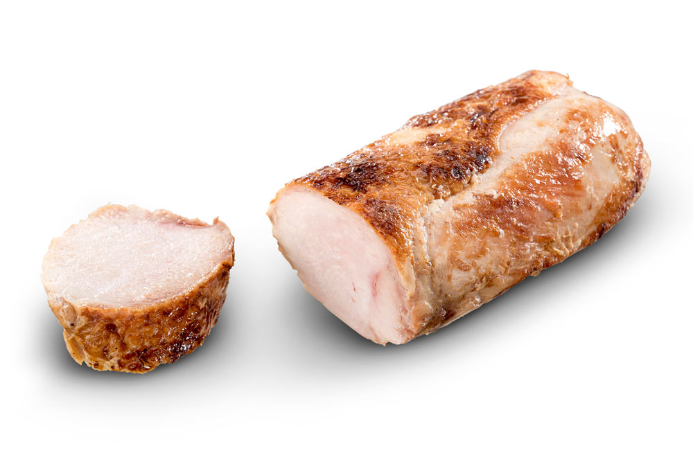Geroosterde kipfilets met vel, bereid in rol. Vacuüm, 400 gram, per stuk.