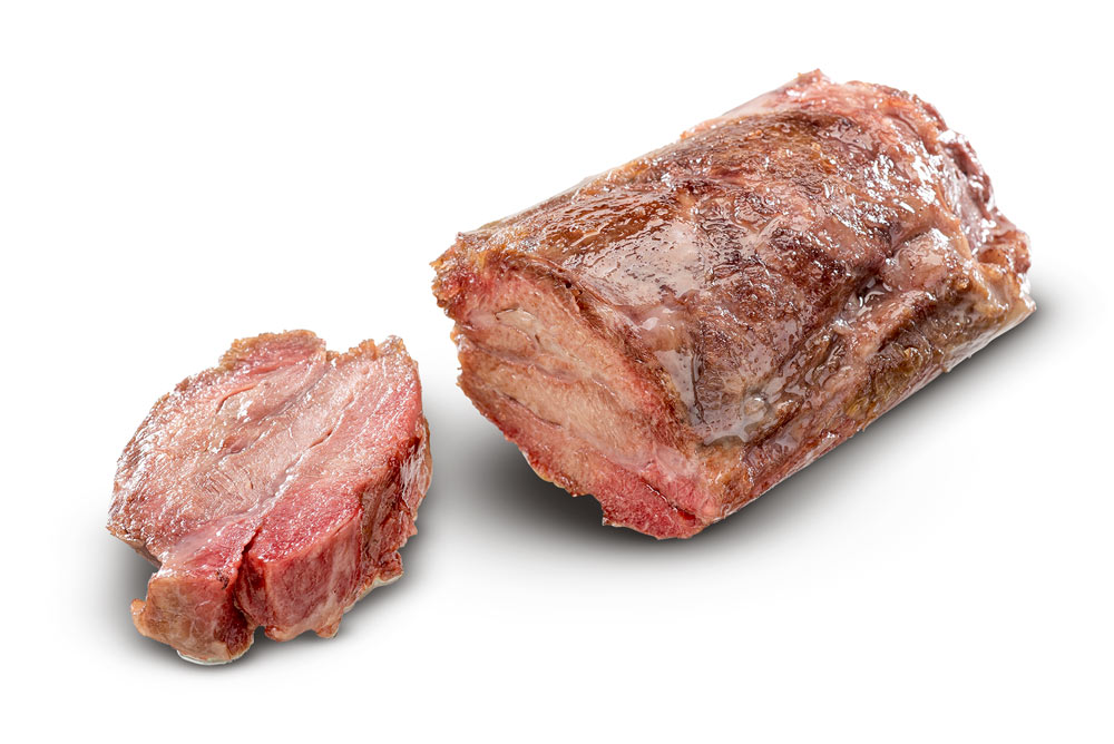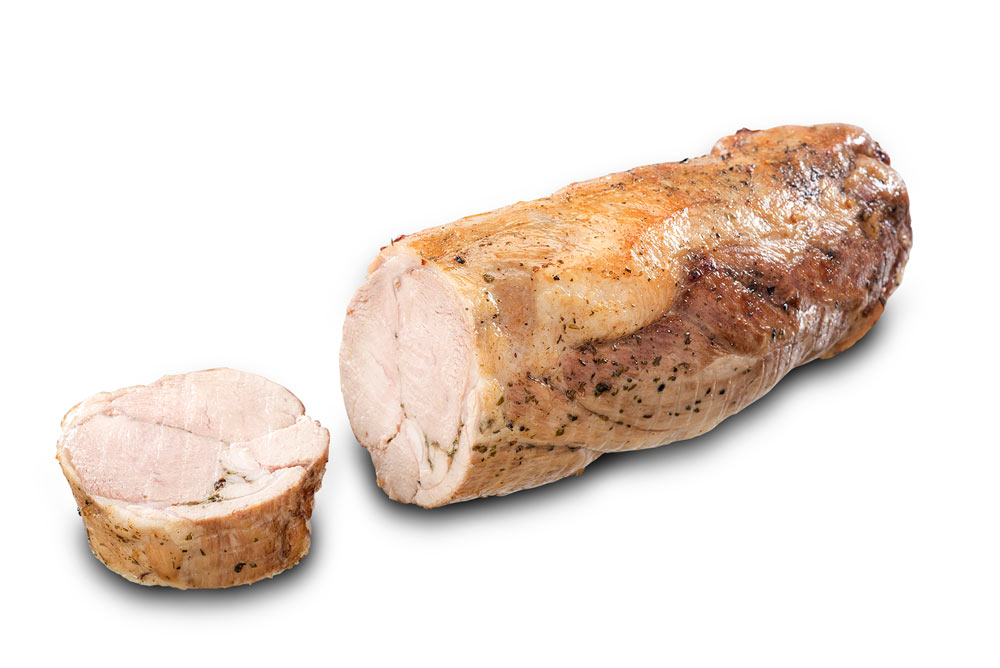 Rol van varkensnek,bereiding op lage temperatuur. Vacuüm, ca. 1100 gram.
